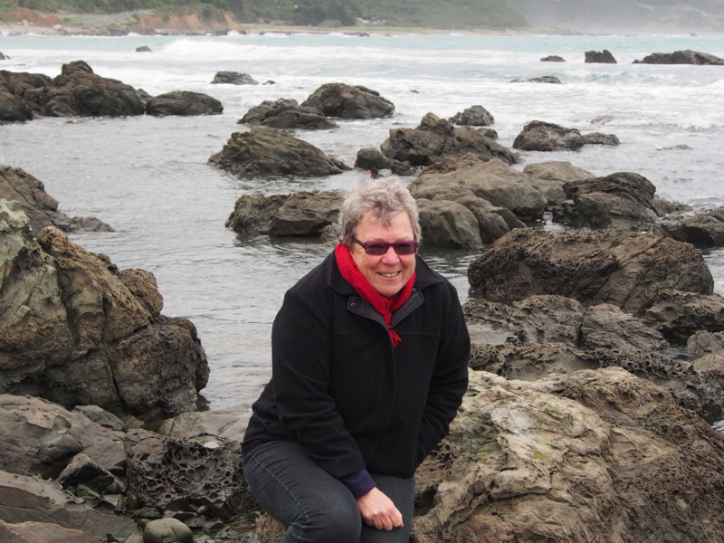 Cynthia knows this road well, but has never stopped here. A Department of Conservation sign and quite a few cars make the spot beside the railroad which we have been following down the coast.